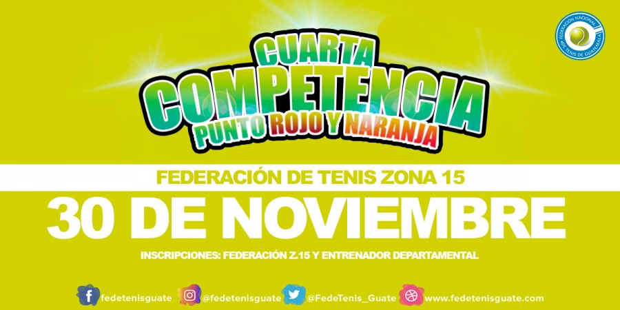 Llegó la cuarta competencia de punto rojo y punto naranja para los más pequeños de casa, esta es tu oportunidad que los inscribas y demuestren sus habilidades, esta competencia tendrá cita el próximo 30 de noviembre en las canchas de la Federación de Tenis zona 15, a partir de las 9 de la mañana.